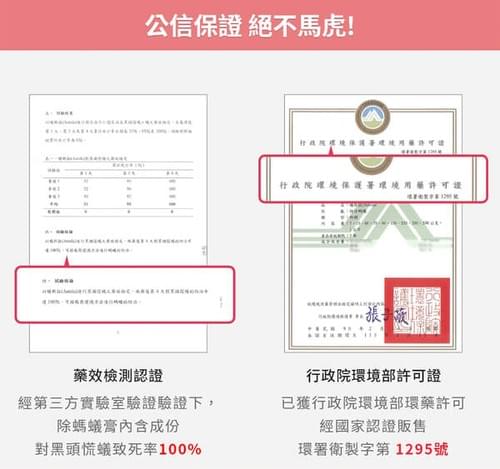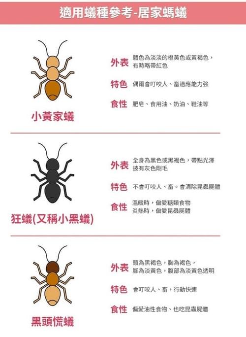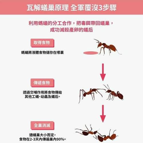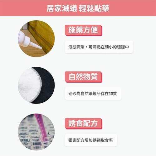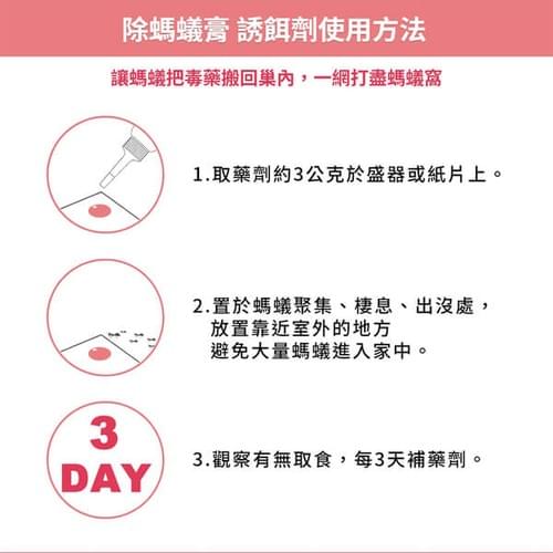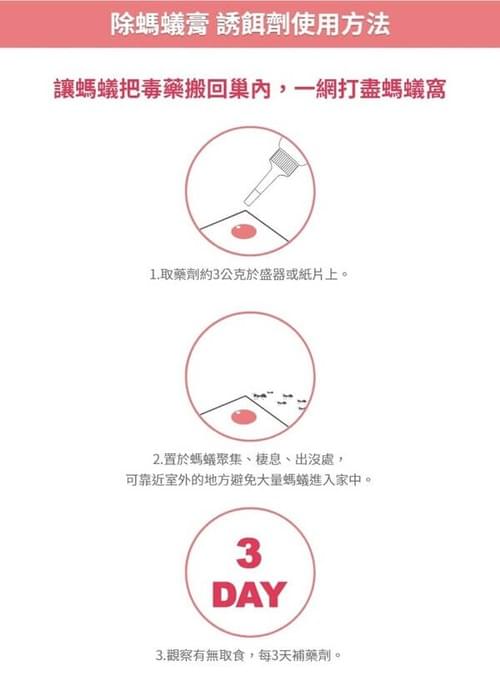 - 使用方法:擰開長嘴上的瓶蓋,取藥劑約3公克於盛器或紙片上,置於螞蟻聚集、棲息、出沒處,蟻群受吸引取食並帶回巢穴,可發揮顯著防治功效