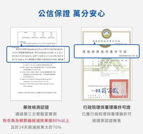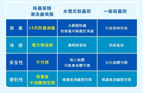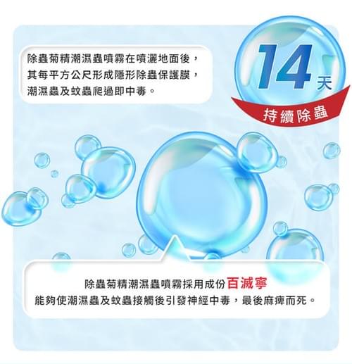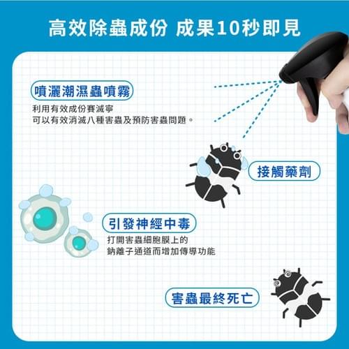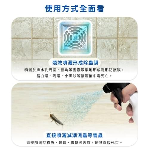6.防治鰹節蟲、衣魚等潮濕蟲:請於牆角、裂縫等害蟲聚集、繁殖、出沒處施以噴灑,藥效可達14天。 - 用途:防治白蟻、衣魚、蚊子、蜘蛛、螞蟻、蟑螂、鰹節蟲、臺灣鋏蠓(小黑蚊)