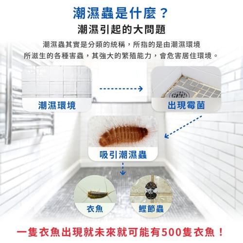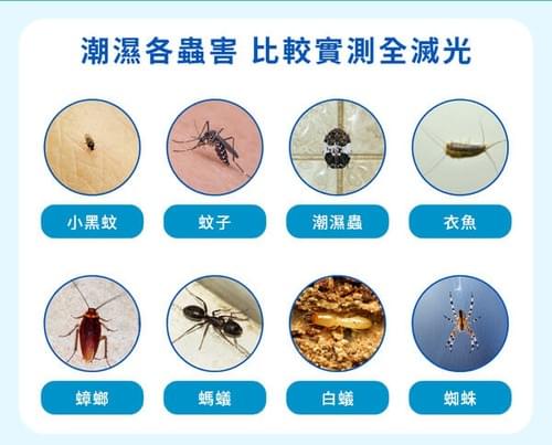 消滅8種害蟲:小黑蚊、蚊子、蜘蛛、螞蟻、白蟻、蟑螂、衣魚、潮濕蟲(例如鰹節蟲、卜泥等)