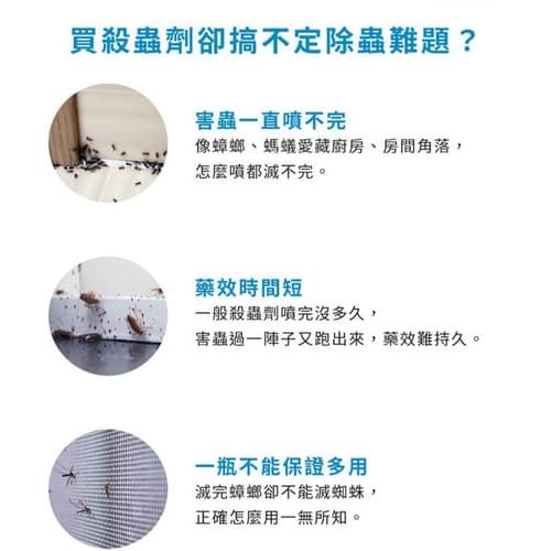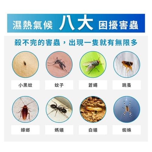 消滅8種害蟲:跳蚤、小黑蚊、蚊子、蜘蛛、白蟻、蒼蠅、螞蟻、蟑螂