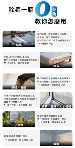 - 2.防治蟑螂:請於害蟲出沒、覓食、聚集,繁殖處施以殘效噴灑,藥效可達14天。