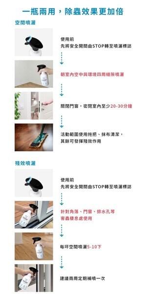 - 1.防治蚊子、蒼蠅:蟻空間噴灑方式後關閉門窗,經30分鐘後,再次進入打開門窗使空氣流通。